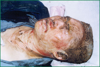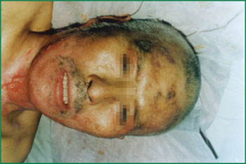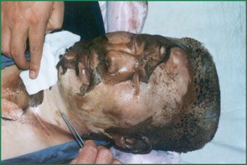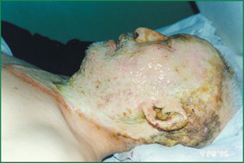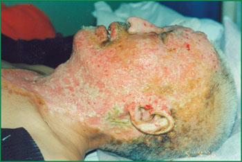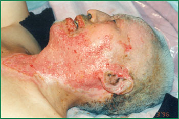 1、 面部淺Ⅲ度火焰燒傷,無(wú)疼痛,無(wú)滲出。