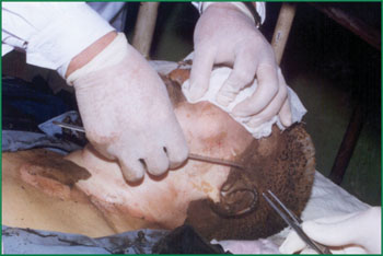 5、 傷后第18天,壞死皮膚液化排除,用紗布無(wú)損傷地吸附液化物。注意保護(hù)創(chuàng)面纖維隔離膜。