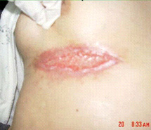 將菜花樣的腫瘤組織用手術(shù)刀削除,削到真皮下層于皮下組織交界處,而后先用美寶燒傷膏包扎,而后采用濕潤暴露療法。