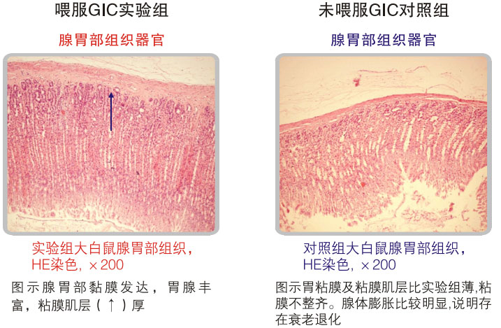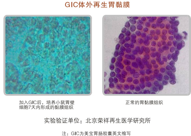對10個月大的雄性大白鼠進(jìn)行526天的胃腸器官原位再生復(fù)原的實驗證明:美寶胃腸再生復(fù)原技術(shù)可保障胃腸黏膜及相關(guān)腺體組織、平滑肌肌層旺盛的活力,未使用美寶胃腸再生復(fù)原技術(shù)對照組的實驗結(jié)果是胃腸黏膜萎縮、老化明顯、腺體明顯減少、平滑肌層變薄。