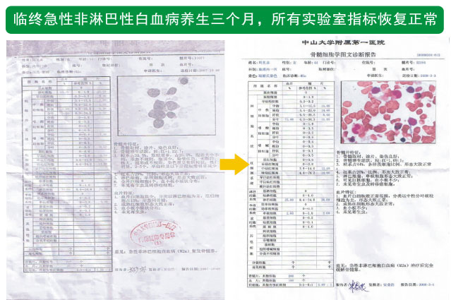 另一位患者是白血病,大家知道白血病比較可怕,但對于我們的養(yǎng)生來說,又顯得不是那么可怕。我們做的動物實驗中可以讓骨髓再生。我們用鈷60的照射破壞骨髓,無論怎么破壞,通過讓骨髓再生,動物的骨髓都可以保持健康,凡是沒有吃再生物質(zhì)的則繼續(xù)惡化。這位患者醫(yī)院診斷為白血病,已經(jīng)多次復(fù)發(fā),醫(yī)院對這位患者已經(jīng)放棄了醫(yī)學治療。1月底加入我們的癌癥養(yǎng)生計劃。到3月3號檢查,她的骨髓已經(jīng)變成正常的了,其身體現(xiàn)在和正常人一樣。
