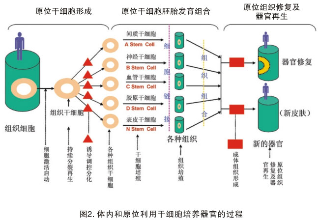 燒傷再生療法是目前唯一能在體內(nèi)和原位培養(yǎng)干細(xì)胞來成功修復(fù)與克隆器官的技術(shù)。相信該技術(shù)能盡早揭開人類生命體延續(xù)之謎。繼成功克隆人體最大器官皮膚后,其他器官的克隆過程將很快被證實(shí)。2002年5月28日,我公布了一項(xiàng)研究成果,人類組織器官再生復(fù)制圖譜,并申請(qǐng)了專利。美國網(wǎng)站www.stemcellresearchnews.com對(duì)這一重大事件做了大篇幅報(bào)道。圖譜客觀地再現(xiàn)了細(xì)胞修復(fù)損傷組織,的確是分化和整合的過程。第一,機(jī)體受傷,存活細(xì)胞原位啟動(dòng),形成成體干細(xì)胞。第二,成體干細(xì)胞被誘導(dǎo)并定向分化為各種組織的干細(xì)胞,將最終完成組織修復(fù)。第三,新生組織產(chǎn)生,再生的組織干細(xì)胞與新生組織連接。最后,各種新生組織組合成器官受損部分,形成新的功能組織器官,進(jìn)而實(shí)現(xiàn)體內(nèi)和原位靶組織器官的修復(fù)與再生(圖2)。