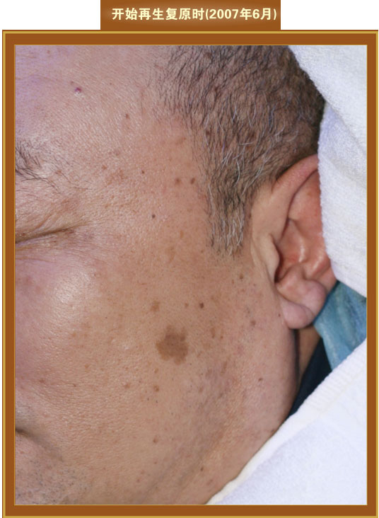 一個衰老色斑皮膚,經(jīng)過三個月皮膚再生復(fù)原技術(shù)的養(yǎng)生,色斑減退或消失,色素組織消失,皮膚再生復(fù)原為年輕狀態(tài)。