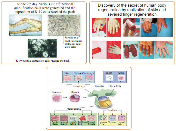 The main focus in our study is to explore further the secondary life cells, especially the origin of these cells.  We believe these cells were left behind during the course of embryo development.  When embryonic cells divided into two, one of which continues to develop into human body; the other ceased and remained in hibernating state till the death of the human body.  It has been generally accepted in the scientific field that these hibernating cells are trash cells.  On the contrary, we have determined these cells are not only useful, but also the secondary life cells, i.e. the copy cells which can further develop under right conditions.  When aging, injury, cancer, or apoptosis occur in human somatic cells, these copy cells will be activated and play a role in renewing those diseased cells in situ.  Here, I will not detail the procedure of the activation of these copy cells; in stead, I want to emphasize one of the human instincts --- regeneration, which is available throughout the life but never displayed.  No scientist worldwide can tell how these cells play their role, for some never succeeded in achieving regeneration while some others just ignored it.  That’s why no one even touched upon the study of these cells.  It might be the same case with the discovery of antibiotics; although it is also a natural existence, no one would think about it before its discovery.  Even till now, there are still countless mysteries remaining to be solved in the nature.  If we haven’t studied burns, we wouldn’t have found the skin regeneration; if we hadn’t revealed the mystery of skin regeneration, we wouldn’t have considered the study on GI tract regeneration and known the possibility of GI tract regeneration; if GI tract regeneration hadn’t been realized; internal organ regeneration like liver regeneration wouldn’t have been studied and succeeded.  Therefore, the human body regenerative restoration is closely related with each other, and the secondary life cells are the key, because each of these cells contains the entire set of information of human body and thus can structurally repair injured or defected tissues and organs completely to achieve human body regeneration.  It is our work to feed and raise these cells rightly so that they can be activated at any time of need to replace the original abnormal cells and regenerate human body.  For example, by severed finger regeneration, we don’t refers to the wound healing, instead, we highlight the regenerative restoration of the lost finger part within the same genetic system as the original human body without any discrepancy in life characters.