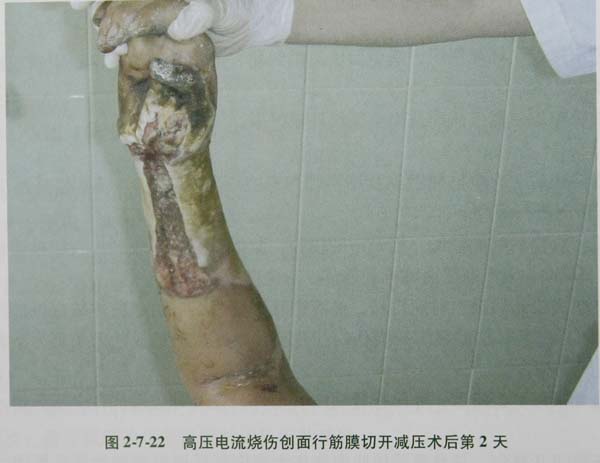 肌肉燒傷伴筋膜腔高壓初期治療。目的是減輕深部組織壓力,保存肢體或盡量保存肢體殘端長度。適時植皮,避免截肢或盡量保留肢體長度的截肢。