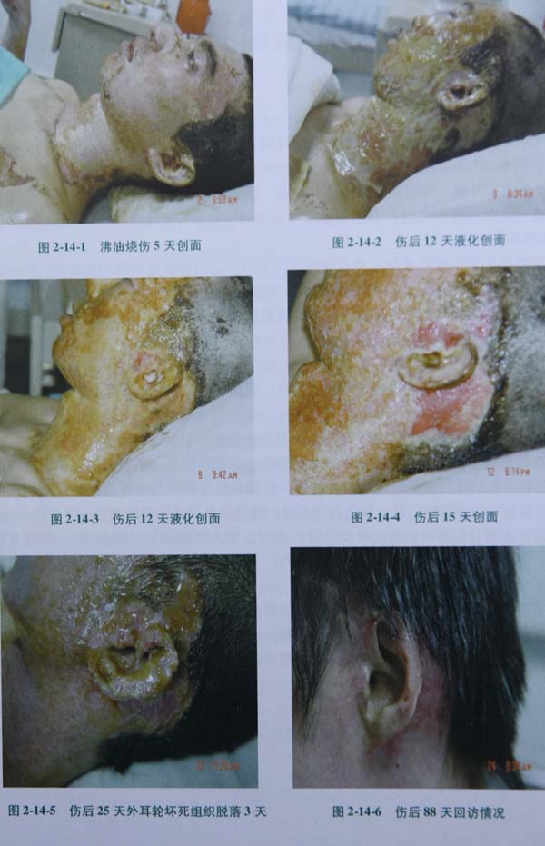 2141沸油燃燒致顏面部燒傷后5天,耳部逐漸出現(xiàn)液化,耳廓外輪蠟黃色,仍連接緊密,不急于清除;圖2142、圖2143燒傷后12天,耳廓周圍壞死頭皮液化排除,肉芽新鮮,耳廓液化佳,但連接仍緊密,換藥時(shí)僅清除液化物、多余藥物、松動(dòng)壞死組織;圖2144燒傷后15天,外耳輪壞死組織浮起,但邊緣仍緊密連接;圖2145燒傷后25天,外耳輪壞死組織脫落3天,肉芽生長(zhǎng)佳,新鮮,繼續(xù)常規(guī)治療;圖2146燒傷后88天,出院后回訪,滿意生理性愈合,持續(xù)美寶疤痕平軟膏治療,形成薄層軟疤。
