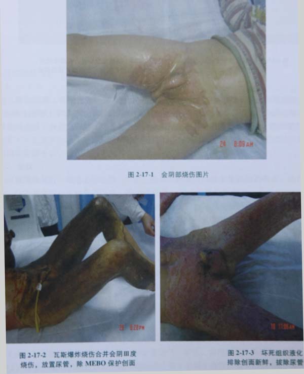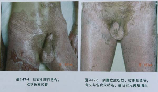 2172瓦斯爆炸致全身多處燒傷,合并會陰部Ⅲ度燒傷,常規(guī)安置尿管,耕耘清創(chuàng),直接將MEBO涂抹在會陰部;圖2173壞死組織不斷液化排除,創(chuàng)面新鮮,拔除尿管,鼓勵自解小便;圖2174創(chuàng)面生理性愈合,見點(diǎn)狀色素沉著;圖2175陰囊皮膚松軟,收縮功能好,包皮長度與傷時無明顯區(qū)別,皮膚仍松軟,可翻開,暴露龜頭,會陰部無瘢痕增生。