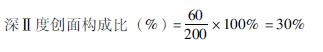 答:深Ⅱ度創(chuàng)面的構(gòu)成比為30%(其他創(chuàng)面構(gòu)成比計算方法與此相同,淺Ⅱ度創(chuàng)面構(gòu)成比為40%,Ⅲ度為305,總和為100%)。