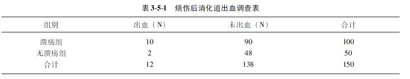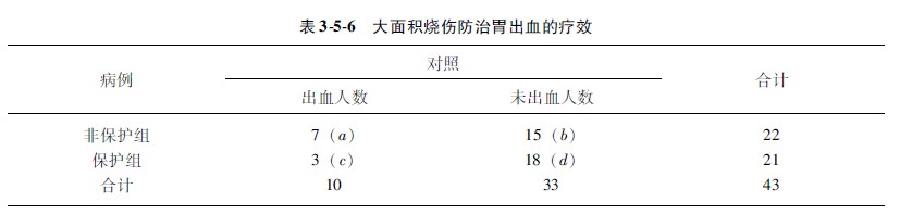 示例354某醫(yī)生研究大面積燒傷采用“胃腸黏膜保護劑”預(yù)防胃出血的作用,資料匯于表356中。問大面積燒傷病人不用“胃腸黏膜保護劑”進行預(yù)防治療,是否是大面積燒傷病人發(fā)生胃出血的危險因素?
