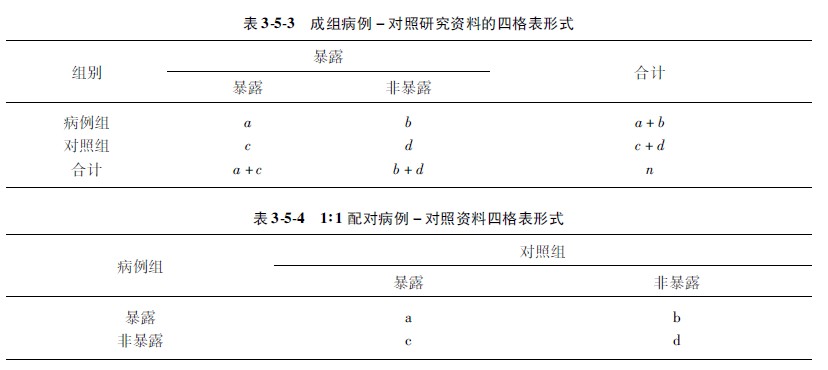 “病例-對照研究”是通過回顧方法比較病例和對照患者在患病前暴露于某種可能的危險因素方面的差異,分析該因素與疾病的可能關(guān)系。病例-對照研究中,如果病例組與對照組的暴露史只取暴露和非暴露兩個水平,常用設(shè)計方法有兩種,一個是成組的病例對照設(shè)計,另一個是配對的病例-對照設(shè)計,即1∶1配對設(shè)計。它們雖然都是采用四格表排列形式,但內(nèi)容布局不一樣(見表353和354)。