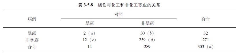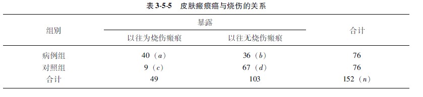 示例353某醫(yī)生研究皮膚瘢痕癌與燒傷瘢痕的關(guān)系,資料匯于表355中。問燒傷瘢痕是否是構(gòu)成燒傷瘢痕癌的危險因素?