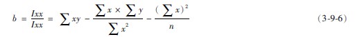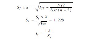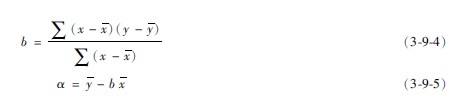 式中y為估計值;α為常數(shù),也稱為截距,即當x等于零時在回歸直線軸上的交點;b為回歸系數(shù),它是回歸直線的斜率,其意義是每當x變動一個單位,則y隨之變動b個單位。