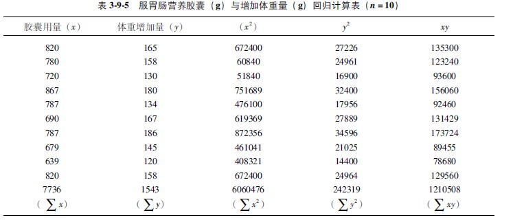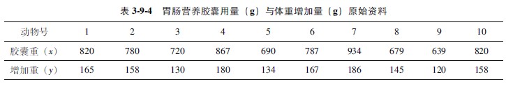 示例393某研究人員觀察胃腸營養(yǎng)膠囊的營養(yǎng)價值,用大白鼠做試驗,對每只大白鼠在觀察期間胃腸營養(yǎng)膠囊的用量(g)和體重增加量(g)匯入表(394)中,根據(jù)原始資料試作直線回歸分析。