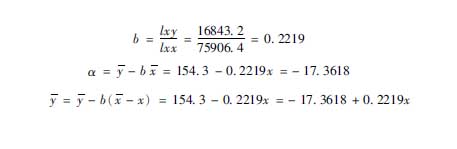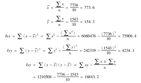 因為已知Iyy=42341,  Ixx=759064,  Ixy=168432,n=10, b=02219,將以上數(shù)據(jù)分別代入公式(3910)、(3911)、(3912),得: