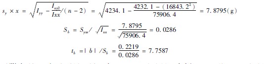 回歸系數(shù)顯著性檢驗的意義與相關(guān)系數(shù)的顯著性檢驗的意義相同,其回歸系數(shù)(b)也是因抽樣研究得來的,即使嚴格按隨機抽樣,回歸系數(shù)也存在抽樣誤差的問題,也應(yīng)進行顯著性檢驗。當y變量服從正態(tài)分布時,回歸系數(shù)的顯著性檢驗可以用t檢驗,也可以用方差分析方法求得。本節(jié)僅介紹t檢驗方法。