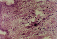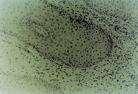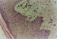 5-3-4a 新生上皮組織和膠原纖維增生,可見典型EB(皮膚胚胎基) HE×40