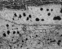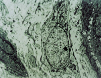 經(jīng)MEBT/MEBO治療10天,創(chuàng)面組織切片可見表皮棘層棘細胞出現(xiàn)并有橋粒連接(圖5-3-14~5-3-15)。顆粒層顆粒細胞出現(xiàn)。在基底細胞層可見黑色素小體(圖5-3-6~5-3-17)。并可見小血管周圍的吞噬細胞有吞噬現(xiàn)象(圖5-3-18),說明其功能也已經(jīng)在恢復。