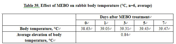   Effect of MEBO on Rabbit Body Temperature. 75% of the rabbits had an increase in body temperature after MEBO treatment. On day 7, the average elevation of body temperature was 0.84°C (Table 39).
