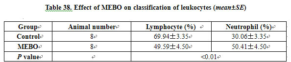 Effect of MEBO on the Classification of Circulating Leukocytes: Table 38 shows that the amount of neutrophil in blood increased after MEBO treatment.