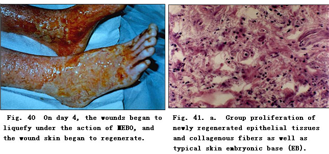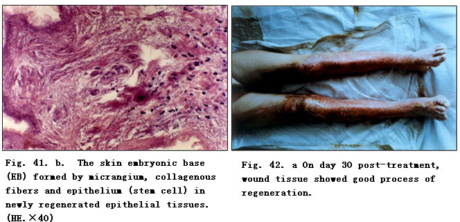 Repeat biopsy at the same burned location was performed for pathological examination.  The results showed massive granular tissues among the necrotic epithelial tissue,a proliferation of newly regenerated epithelial cells with collagenous fibers, as well as the typical skin embryonic base (EB, Fig. 41. a,b). After a 10-day application of MEBO, the comparably primitive epithelial tissues were observed under pathological examination of epithelial tissues sampled from the wound edge.