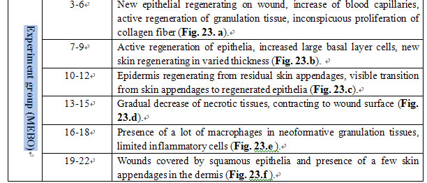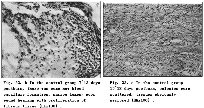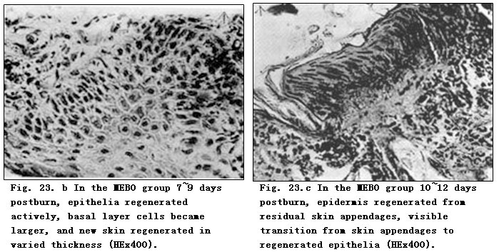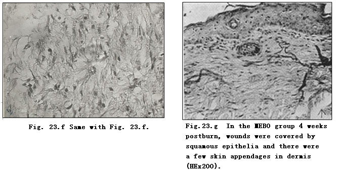 According to our experimental results, in the control group there was sparse blood capillary formation with narrow lumen. The tissue was swollen with fiber proliferation and massive infiltration of inflammatory cells. The disruption of collagen fiber and absence of regenerated epidermis to cover wounds eventually resulted in wound healing by eschar (showed in Fig. 22. d). In the experimental group treated with MEBO, residual skin appendages regenerated into epidermis with multilayers and large nuclei that progressed and covered the wounds (Fig. 23. b-d). Granulation tissue was promoted into regenerative tissue; neoformative blood capillaries were enhanced more than in the control group with larger lumen and richer blood supply, both of which facilitate an enhanced metabolism (Fig. 23. a). Finally, wounds in the experimental group were covered by squamous epithelia and healed without scarring (Fig. 23.g). We noted that when burns wounds were treated by BRT with MEBT/MEBO, the perpetually changing cells began to divide and proliferate toward the wound center along the wound edges or the basal part of residual epithelia, whereas after burns injury, the stable cells residing in skin appendages and grandular epithelium were activated to divide and regenerate into epidermic tissue that in turn migrated toward and finally closed the wound. Pathological examination on days 10-12 postburn showed a transitional migration from skin appendages to regenerated epithelia. When epithelia proliferated and divided, wounds were covered by stratified squamous epithelium. The macroscopic appearance of healed wounds was initially in red or pink and progressively became normal in color.