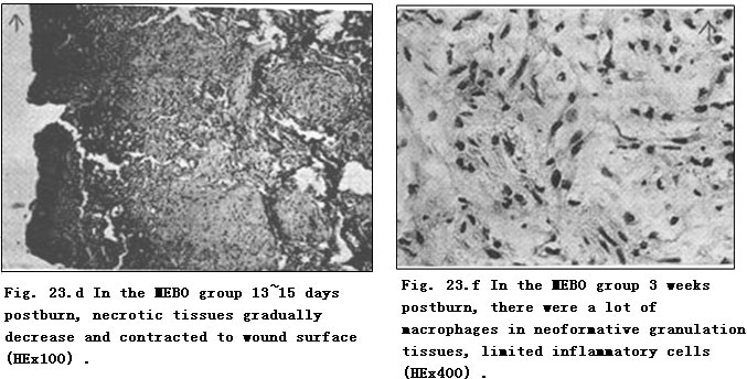 In the experiment, wounds were contaminated by S. aureus. Microscopic observation showed massive infiltration and aggregation of inflammatory cells in the Vaseline group with few macrophage and scattered colonies without boundaries (Fig. 22.c). All wounds were visibly infected within 1 week. In the MEBO group, inflammatory cells were large in quantity with enhanced capacity of anti-infection (Fig. 23.e). Gross observation revealed that wounds in this group repaired rapidly with absence of inflammatory response such as red swelling. It was believed that MEBO demonstrated efficacy in promoting blood circulation by removing blood stasis, clearing away heat and toxic material, relieving inflammation and removing the necrotic tissue while promoting granulation. The experiment also demonstrated that MEBO might inhibit or kill the growth of S. aureus.
