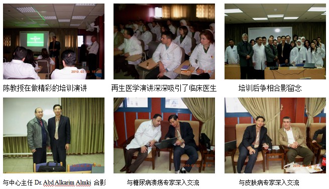 三、2010年2月3日中午,陳教授應(yīng)邀到衛(wèi)生部Damascus Dermatology Medical Center(衛(wèi)生部大馬士革皮膚病醫(yī)療中心),對(duì)該中心的皮膚科、糖尿病潰瘍科和皮膚創(chuàng)傷科的30多名醫(yī)師進(jìn)行了再生醫(yī)學(xué)技術(shù)培訓(xùn),該中心的主任Dr. Abd Alkarim Almki 主持了培訓(xùn)會(huì)議,陳教授以“再生醫(yī)學(xué)技術(shù)促進(jìn)皮膚損傷愈合的機(jī)理與臨床應(yīng)用”為題,介紹了再生醫(yī)學(xué)在皮膚科和創(chuàng)瘍領(lǐng)域的臨床應(yīng)用經(jīng)驗(yàn),大家學(xué)得非常認(rèn)真,覺得這次的培訓(xùn)為他們治療各種皮膚疾病找到了更有效的方法。再生醫(yī)學(xué)培訓(xùn)在該院引起了很大的轟動(dòng)和反響,掀起了大家學(xué)習(xí)、應(yīng)用再生醫(yī)學(xué)技術(shù)的熱情和積極性。