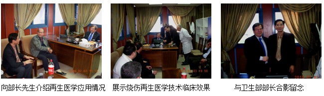 四、2010年2月3日下午,在衛(wèi)生部附屬皮膚病醫(yī)療中心主任Dr. Abd Alkarim Almki的推薦和聯(lián)系下,陳教授一行約見了敘利亞衛(wèi)生部部長Dr. Reda Saed。在會(huì)見期間,陳教授向衛(wèi)生部部長介紹了燒傷再生醫(yī)學(xué)技術(shù)的先進(jìn)性、實(shí)用性和該技術(shù)在中國和其它國家的臨床應(yīng)用情況以及取得的良好的臨床治療效果。部長對(duì)燒傷再生醫(yī)學(xué)技術(shù)非常感興趣,希望以后有機(jī)會(huì)到中國進(jìn)行實(shí)地參觀、考察。這次能夠約見敘利亞衛(wèi)生部部長,為燒傷再生醫(yī)學(xué)技術(shù)在敘利亞的學(xué)術(shù)、技術(shù)全面推廣爭取政府的支持和幫助做好了準(zhǔn)備。