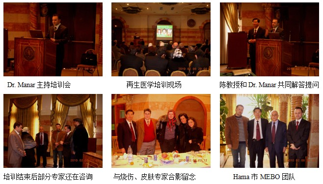 九、2010年2月8日下午2時(shí),Hama市再生醫(yī)學(xué)技術(shù)臨床應(yīng)用培訓(xùn)班在Cham Palace Hotel成功舉辦。來自全市各醫(yī)院和診所的燒傷、整形、普外、骨科、婦產(chǎn)科、皮膚科的35名臨床專家和5名藥劑師參加了“燒傷再生醫(yī)學(xué)技術(shù)在燒傷、創(chuàng)傷與潰瘍的”專題演講會(huì),反響熱烈,培訓(xùn)效果較好。
