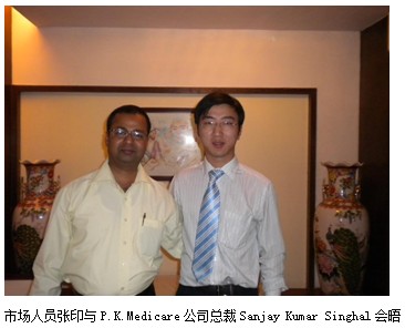 伴隨著美寶濕潤燒傷膏印度三期臨床試驗工作的不斷推進,美寶國際集團印度市場的前期開發(fā)和準備工作也被提上日程。幾個月以來,經(jīng)過美寶國際集團國際部的市場人員對印度市場開發(fā)工作的不斷努力,印度多家醫(yī)藥公司對美寶的再生復原科學技術及其再生產(chǎn)品產(chǎn)生了濃厚的興趣。2010年3月2日至2010年3月5日,美寶國際集團國際部市場人員張印應印度P.K.Medicare公司總裁Sanjay Kumar Singhal和印度Elder醫(yī)藥公司生物技術部總經(jīng)理Sharad A. Dahatonde的邀請,前往印度孟買P.K.Medicare公司和Elder醫(yī)藥公司進行了初步的技術交流和商務溝通。