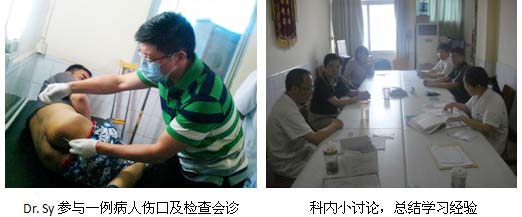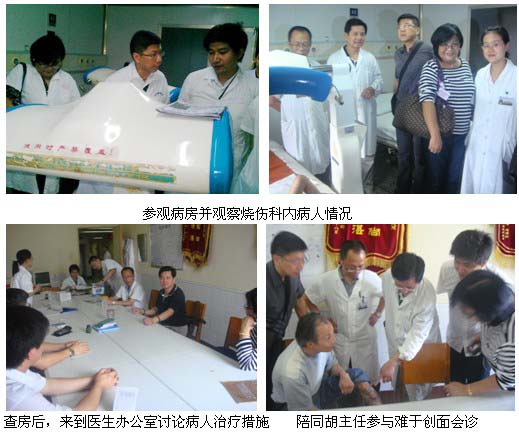 2011年6月20日至6月24日,兩名國(guó)外專家在南充市川北醫(yī)學(xué)院附屬醫(yī)院燒傷科參觀學(xué)習(xí)。其間,在周國(guó)富主任醫(yī)師,項(xiàng)曉燕主治醫(yī)師,陳剛主治醫(yī)師及其他科內(nèi)醫(yī)護(hù)人員的帶領(lǐng)下,外國(guó)專家每天到病 房觀察燒傷病人創(chuàng)面在再生醫(yī)療技術(shù)的幫助下,如何一天天原位再生復(fù)原;同時(shí),為了更好的達(dá)到此次學(xué)習(xí)目的,在科內(nèi)專門組織了數(shù)次科內(nèi)的小型討論會(huì),專門對(duì)大面積燒傷患者系統(tǒng)治療方面如何進(jìn)行補(bǔ)液,抗感染等要點(diǎn)作了深入的研討;通過(guò)深入回顧科內(nèi)年初成功搶救的一例大面積燒傷患者的病歷資料,國(guó)外專家對(duì)系統(tǒng)治療的要點(diǎn)有了深刻的把握,尤其是與傳統(tǒng)方法的區(qū)別。