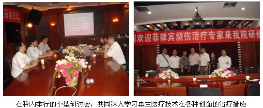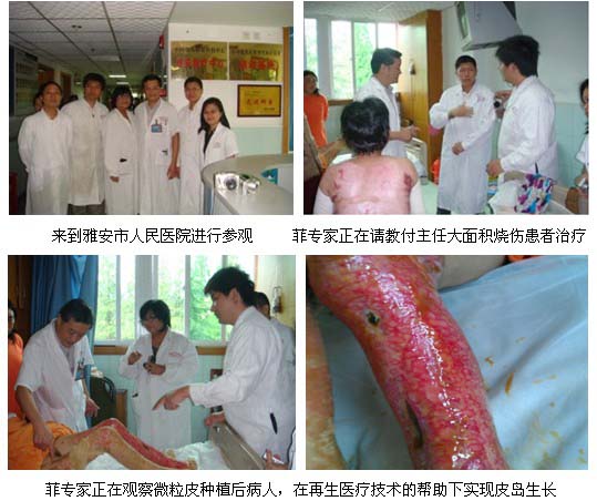 2011年6月27日至7月2日,兩名專家來(lái)到雅安市人民醫(yī)院燒傷科進(jìn)行學(xué)習(xí)再生醫(yī)療在介紹了微粒皮種植的流程;其間有一例患者正從微粒皮種植的手術(shù)中逐漸恢復(fù),傷口上生長(zhǎng)的皮島正在連接成片。付主任解釋說(shuō),如果按照傳統(tǒng)的方法換藥,種植的微粒皮是不可能在創(chuàng)面上存活并且生成皮島,正是有了再生醫(yī)學(xué)技術(shù)獨(dú)有的干細(xì)胞培養(yǎng)過(guò)程,才使得微粒皮種植培養(yǎng)皮島得以實(shí)現(xiàn)。此外,除了燒傷病人,各種外傷及慢性創(chuàng)面患者也都在再生醫(yī)療技術(shù)的幫助下獲得了良好的治療和康復(fù)。Dr. Mijares盡管只有一年再生醫(yī)療技術(shù)的使用經(jīng)驗(yàn),但仍然驚訝于再生醫(yī)療技術(shù)在多學(xué)科應(yīng)用所取得的成就并且表示回國(guó)后將致力于再生醫(yī)學(xué)在菲律賓的發(fā)展。