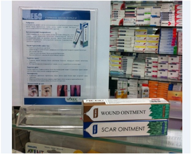 圖為美寶產(chǎn)品在一家叫Island的藥店,創(chuàng)傷膏銷量排名第二,僅次于多年前進(jìn)入蒙古市場的一款俄羅斯創(chuàng)傷產(chǎn)品,其價格是美寶產(chǎn)品的五分之一。