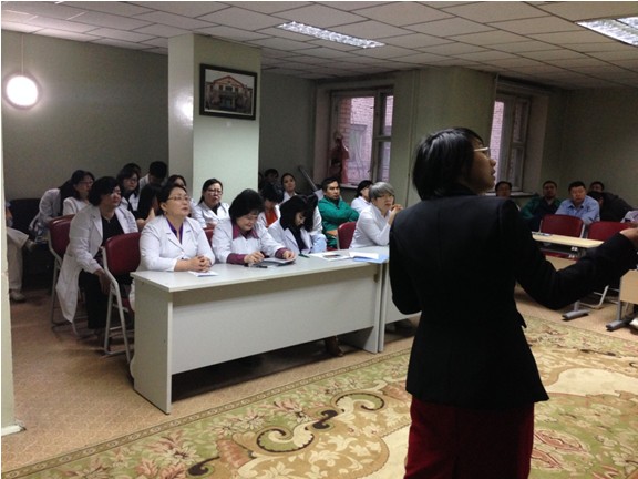 2月20日中午12點(diǎn),美寶團(tuán)隊(duì)來到烏蘭巴托的青格爾泰區(qū)中心醫(yī)院,培訓(xùn)內(nèi)容涵蓋了出席的20位醫(yī)生專業(yè)領(lǐng)域,包括再生療法在糖尿病潰瘍,褥瘡,靜脈潰瘍,創(chuàng)傷,手術(shù)創(chuàng)面及婦科應(yīng)用。醫(yī)生們對展示的典型案例很感興趣,詢問了具體的治療過程,換藥操作,并且又一次表達(dá)了試用疤痕平的愿望。Myadagmaa 醫(yī)生是該院的婦產(chǎn)科醫(yī)生,看到展示的婦科手術(shù)創(chuàng)面的應(yīng)用后,急切的咨詢在婦科方面的其它應(yīng)用,張美艷介紹了再生療法在宮頸電環(huán)切除術(shù),剖腹產(chǎn)手術(shù),腹腔鏡手術(shù),會陰切開術(shù),會陰撕裂傷及宮頸糜爛等方面的應(yīng)用,與醫(yī)生互換了名片,贈送了美寶的學(xué)習(xí)光盤及幾年品,答應(yīng)通過郵件等方式解答病例咨詢及臨床應(yīng)用問題。
