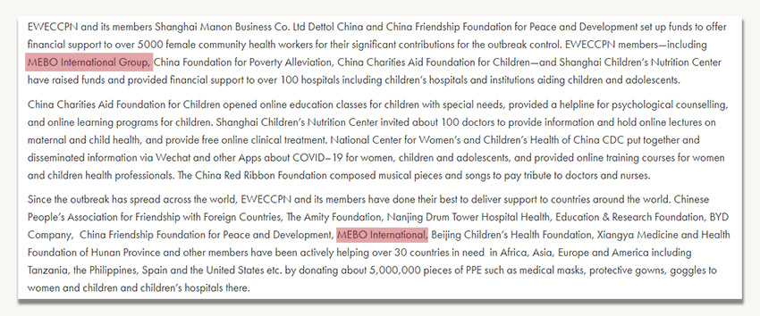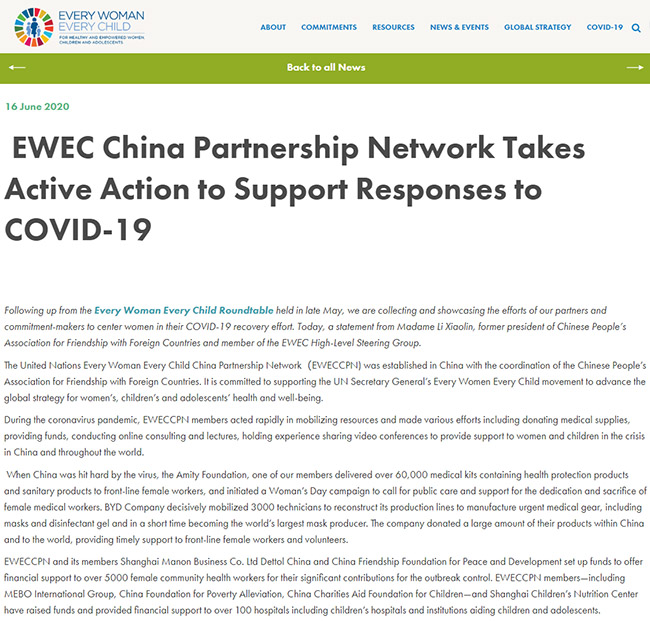 2020年6月16日,中國人民對(duì)外友好協(xié)會(huì)前會(huì)長(zhǎng)、聯(lián)合國“每個(gè)婦女 每個(gè)兒童”高級(jí)指導(dǎo)委員會(huì)成員李小林署名文章《聯(lián)合國“每個(gè)婦女 每個(gè)兒童”中國合作伙伴網(wǎng)絡(luò)積極行動(dòng)抗擊疫情》在聯(lián)合國“每個(gè)婦女 每個(gè)兒童“官網(wǎng)首頁刊登。文章指出中國伙伴網(wǎng)絡(luò)在新冠肺炎疫情期間,快速行動(dòng),充分發(fā)揮和匯聚各成員優(yōu)勢(shì)資源和力量,通過捐贈(zèng)物資、募集善款、開設(shè)云課堂、召開經(jīng)驗(yàn)分享視頻會(huì)議等多種形式助力中國和全球的婦女兒童抗擊疫情,其中特別提到了美寶集團(tuán)在這次抗疫行動(dòng)中的突出表現(xiàn)。