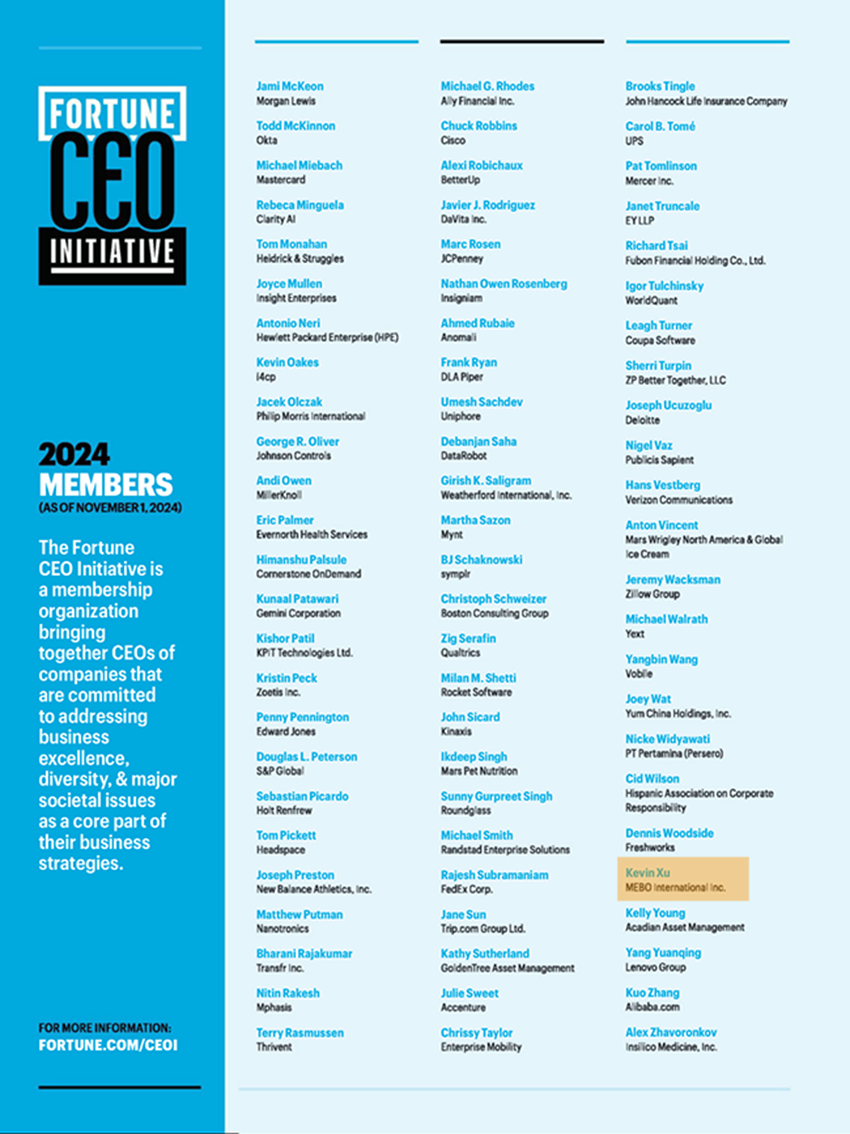 2024 年 12 月,《財(cái)富》雜志跨年期刊正式公布了財(cái)富 CEO 倡議 2024 年名單,美寶集團(tuán)董事局主席、APEC 2023 籌委會主席徐鵬再度成功入列。自 2017 年財(cái)富 CEO 倡議發(fā)起以來,這已是徐鵬第五次登上該名單。