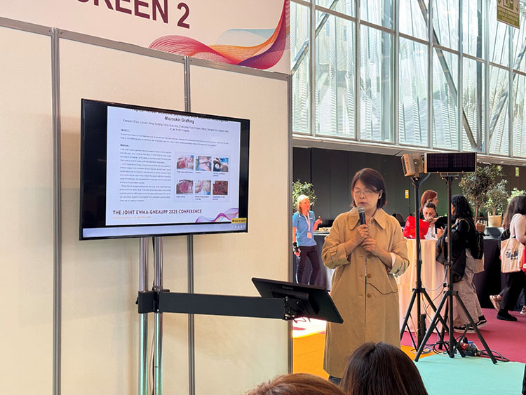 除展臺(tái)的展示外,再生醫(yī)療技術(shù)更是在會(huì)議中掀起一次次學(xué)術(shù)浪潮。大會(huì)首日下午,題為“重塑創(chuàng)面治療:從臨床實(shí)踐到技術(shù)創(chuàng)新”的再生醫(yī)療技術(shù)研討會(huì)順利召開。作為推動(dòng)克林頓全球倡議(CGI)——“歐洲修復(fù)計(jì)劃:賦能歐洲再生醫(yī)療網(wǎng)絡(luò)構(gòu)建”的又一關(guān)鍵活動(dòng),研討會(huì)圍繞再生醫(yī)療技術(shù)在急慢性創(chuàng)面中的創(chuàng)新應(yīng)用展開討論。來自沙特 Sulaiman Al Habib醫(yī)療集團(tuán)外科的Ziad Dalloul首先分享了馬喬林潰瘍的臨床管理策略,深入探討了再生醫(yī)療技術(shù)在復(fù)雜創(chuàng)面中的應(yīng)用及優(yōu)勢(shì)。隨后,西安市第九醫(yī)院燒傷整形科周小茜帶來了應(yīng)用自創(chuàng)微粒皮漿種植結(jié)合再生醫(yī)療技術(shù)治療慢性創(chuàng)面的演講,充分展示了該技術(shù)在促進(jìn)慢性創(chuàng)面愈合中的優(yōu)勢(shì)。最后,來自菲律賓Quirino Memorial醫(yī)療中心燒傷科的Nikki Valencia分享了一項(xiàng)最新的系統(tǒng)回顧,全面證實(shí)了再生醫(yī)療技術(shù)在燒傷治療中的綜合療效、安全性、疼痛緩解及感染預(yù)防方面的顯著療效。