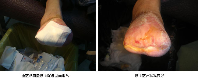 患者徐某,男,59歲,糖尿病20年。因糖尿病足壞疽在某省級醫(yī)院就診建議截肢,患者不愿意截肢轉(zhuǎn)院到哈爾濱醫(yī)科大學(xué)第一臨床醫(yī)院就診。入院診斷:1)Ⅰ型糖尿??;2)右下肢動脈閉塞性右糖尿病足壞疽半年。經(jīng)使用皮膚再生醫(yī)療技術(shù)及產(chǎn)品燒傷膏、速愈貼治療90天,創(chuàng)面基本愈合。