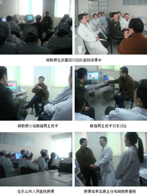 胡教授首先應(yīng)武警四川總隊醫(yī)院燒傷整形科袁文周主任的邀請,來到燒傷整形科對該科室人員進行再生醫(yī)療技術(shù)講座,科室全體人員共計12人參加。胡教授和袁文周主任做了近40分鐘的交流,隨后開始兩個多小時的再生醫(yī)療技術(shù)的專題講座。講座中胡教授從基礎(chǔ)的再生醫(yī)學(xué)理論講到再生醫(yī)療技術(shù)臨床應(yīng)用,用大量的、翔實的臨床病例介紹了不同病種臨床規(guī)范治療方法和最新的再生醫(yī)療技術(shù)臨床應(yīng)用進展。其中微粒皮的種植方法和斷指再生的病例介紹引起了大家強烈的關(guān)注和熱烈的討論。