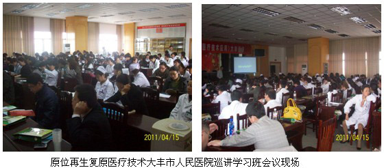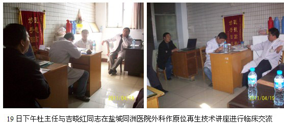 4月19日下午杜福勤主任和吉曉紅同志在鹽城同洲醫(yī)院外科作原位再生技術(shù)在燒傷創(chuàng)傷潰瘍創(chuàng)面中的臨床實(shí)踐講座,并對(duì)臨床的實(shí)際遇到的問(wèn)題進(jìn)行了交流,結(jié)合臨床面對(duì)面的交流溝通,受到良好的效果。