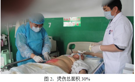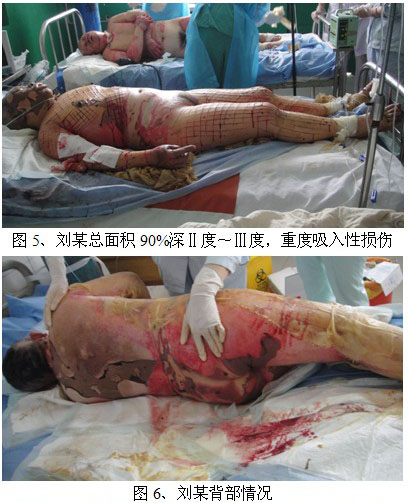 北京燒傷創(chuàng)瘍研究所醫(yī)療部主任王廣順教授于2011年4月30日下午19:15分,應(yīng)該院楊院長(zhǎng)、張西軍主任、馬思泉主任的邀請(qǐng),在山東省辦事處劉玉芳同志陪同下來(lái)到該院重癥監(jiān)護(hù)室查看了3名燒傷患者,他們都是傷后時(shí)間約20個(gè)小時(shí)左右,分別是太陽(yáng)能熱水器故障燙傷總面積30%、腦外傷、頭皮裂傷;鍋爐爆炸燒傷張某燒傷總面積達(dá)85%TBSA,為深Ⅱ度~Ⅲ度燒傷,重度吸入性損傷;劉某燒傷總面積90%TBSA,為深Ⅱ度~Ⅲ度燒傷,重度吸入性損傷。前者處在嗜睡狀態(tài),后二者血小板僅54×109/L,張某尿色深混濁,7個(gè)小時(shí)內(nèi)尿量?jī)H300ml,躁動(dòng)不安,創(chuàng)面腫脹、硬無(wú)彈性。王教授立即對(duì)Ⅲ度創(chuàng)面進(jìn)行“切劃減張療法”,并涂美寶濕潤(rùn)燒傷膏及用美寶創(chuàng)瘍貼止血治療。平衡鹽液糾正水電介質(zhì)酸堿紊亂、20%甘露醇125ml-速尿20mg-利多卡因50mg-654-25mg組成的利尿合劑、血必凈、生脈注射液、補(bǔ)充血小板等全身治療方案,目前患者血小板已回升、尿量增加,病情逐漸穩(wěn)定。