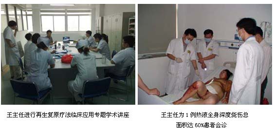 為讓該醫(yī)院燒傷外科的醫(yī)護(hù)人員盡快掌握、應(yīng)用原位再生復(fù)原醫(yī)療技術(shù)救治大面積深度燒傷,2011年5月4日,中國(guó)中西醫(yī)結(jié)合學(xué)會(huì)燒傷專(zhuān)業(yè)委員會(huì)常委、中國(guó)燒傷創(chuàng)瘍雜志社副總編輯、北京燒傷創(chuàng)瘍研究所副所長(zhǎng)、臨床部主任王洪生研究員應(yīng)邀到該醫(yī)院為一例成人大面積深度燒傷患者會(huì)診,指導(dǎo)對(duì)該患者的救治,為確保該患者的成功救治及讓該醫(yī)院燒傷外科的醫(yī)護(hù)人員全面掌握對(duì)大面積深度燒傷規(guī)范的臨床處理和全身綜合治療技術(shù),2011年5月12日,王洪生主任再次蒞臨該醫(yī)院,跟蹤指導(dǎo)對(duì)該例大面積深度燒傷的救治工作,當(dāng)日上午,在為該患者會(huì)診后,北海市中醫(yī)醫(yī)院普外科(燒傷外科,神經(jīng)、泌尿外科)主任史國(guó)恩和副主任蔡漢章及其科室醫(yī)生護(hù)士強(qiáng)烈要求王主任給他們做一個(gè)詳細(xì)的再生復(fù)原療法療法臨床應(yīng)用學(xué)術(shù)講座,王主任欣然接受了他們的請(qǐng)求,在該科室醫(yī)生辦公室以“再生復(fù)原療法技術(shù)在大面積深度燒傷及難愈性創(chuàng)瘍創(chuàng)面臨床規(guī)范化處理”為題為該科室的醫(yī)護(hù)人員進(jìn)行了專(zhuān)題講座。在學(xué)術(shù)講座中,王主任對(duì)燒傷的深度劃分結(jié)合臨床圖片做了生動(dòng)的講解,對(duì)燒傷創(chuàng)面前期和后期的處理方法、抗感染、營(yíng)養(yǎng)支持療法、臟器功能保護(hù)、并發(fā)癥防治,并結(jié)合大量的臨床圖片對(duì)各種難愈性創(chuàng)傷,潰瘍創(chuàng)面的規(guī)范處理方法與技巧做了詳細(xì)地講解。