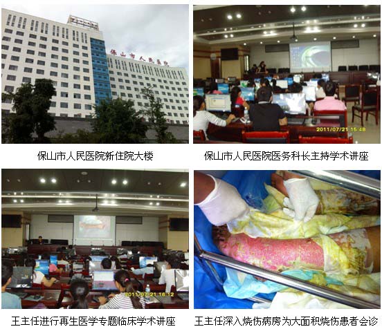 當(dāng)日下午2:30學(xué)術(shù)講座在保山市人民醫(yī)院電化教學(xué)廳舉行,該醫(yī)院醫(yī)務(wù)科長(zhǎng)主持了學(xué)術(shù)講座,王主任應(yīng)邀以“再生復(fù)原療法在燒傷和難治性創(chuàng)傷潰瘍創(chuàng)面臨床規(guī)范化處理及新進(jìn)展”為題進(jìn)行了專題臨床學(xué)術(shù)講座。在學(xué)術(shù)講座中,王主任以大量的臨床實(shí)例及錄像治療直觀而深入淺出的介紹不同深度燒傷創(chuàng)面的規(guī)范化處理及各種難愈性創(chuàng)面的臨床治療要點(diǎn),大量典型臨床病例的展示,看得在場(chǎng)醫(yī)護(hù)人員目瞪口呆。然后王主任又以汶川地震中的傷員為例講了擠壓傷和鋼板外露等創(chuàng)面的處理方法,兩個(gè)多小時(shí)的精彩講述贏得了在場(chǎng)醫(yī)護(hù)人員的一次又一次熱烈的掌聲。會(huì)后應(yīng)保山市人民醫(yī)院醫(yī)務(wù)科及燒傷科楊主任的邀請(qǐng),王主任來(lái)到該醫(yī)院燒傷科為一例汽油火焰燒傷總面積達(dá)60%TBSA大面積患者會(huì)診,患者家屬感動(dòng)的說我女兒真有福。
