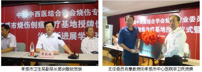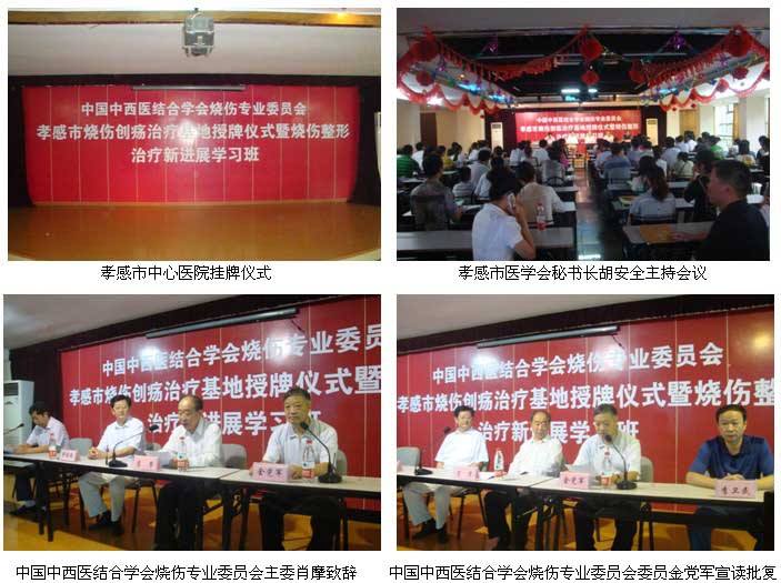 2011年8月28日,由孝感市中心醫(yī)院主辦成立了中國中西醫(yī)結(jié)合學(xué)會燒傷專業(yè)委員會孝感市燒傷創(chuàng)瘍治療基地醫(yī)院。會議在孝感市中心醫(yī)院仁濟(jì)堂三樓學(xué)術(shù)報告廳隆重召開。出席本次會議的有中國中西醫(yī)結(jié)合學(xué)會燒傷專業(yè)委員會主任委員、中國燒傷創(chuàng)瘍雜志社社長、燒傷創(chuàng)瘍中心研究所所長肖摩教授;中國中西醫(yī)結(jié)合學(xué)會燒傷專業(yè)委員會委員、燒傷創(chuàng)瘍研究所副所長金黨軍教授:孝感市衛(wèi)生局郭建敏局長;孝感市衛(wèi)生局人事科教科科長、市醫(yī)學(xué)會胡安全秘書長;孝感市中心醫(yī)院李為民院長;孝感市第一人民醫(yī)院、孝感市第三人民醫(yī)院、孝感市婦幼保健院、應(yīng)城市人民醫(yī)院、大悟縣人民醫(yī)院及各鄉(xiāng)鎮(zhèn)衛(wèi)生院醫(yī)護(hù)人員130余人參加了此次會議。