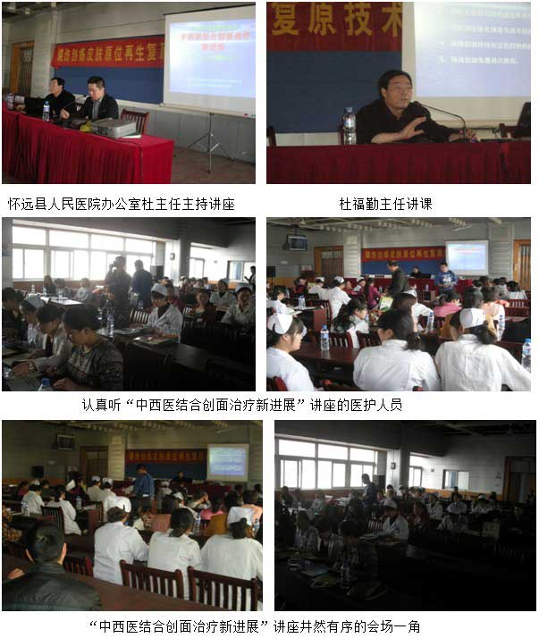 2012年10月21日至24日中國中西醫(yī)結(jié)合學會燒傷專業(yè)委員會委員、北京美寶燒傷創(chuàng)瘍研究所臨床部主任杜福勤和學會駐安徽辦事處張勇同志應(yīng)懷遠縣人民醫(yī)院辦公室杜主任的邀請,23日下午15:00為懷遠縣人民醫(yī)院外科、內(nèi)科、婦產(chǎn)科、骨科、內(nèi)二科、五官科等科室及中醫(yī)院舉辦了“中西醫(yī)結(jié)合創(chuàng)面治療新進展”講座,講座由醫(yī)院辦公室杜主任主持,60余名醫(yī)護人員參加了講座學習,杜福勤主任結(jié)合臨床實踐圖文并茂的介紹了再生醫(yī)療技術(shù)的創(chuàng)立、理論基礎(chǔ)研究、臨床實踐以及國內(nèi)外的臨床實踐研究和臨床發(fā)展。介紹了2012年5月江蘇南通國際學術(shù)會議成功召開的情況。下午五點,進行了二個多小時的講座在多次熱烈掌聲中結(jié)束。會議介紹后,杜福勤主任應(yīng)衛(wèi)生局一位領(lǐng)導邀請為一名膽囊手術(shù)刀口不愈合患者會診,介紹應(yīng)用MEBO創(chuàng)瘍貼換藥治療刀口難愈創(chuàng)面的方法和技巧,受到患者及家屬的歡迎。