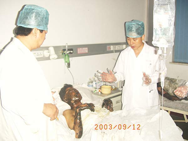 2003年9月11日上午10時(shí),河北武安某煤礦因瓦斯爆炸致11人燒傷,其中8例傷情較重的出者于傷后2小時(shí)轉(zhuǎn)入河北省邢臺(tái)礦物局總醫(yī)院;該批患者入院后,該院燒傷科的全體醫(yī)護(hù)人員緊急行動(dòng)起來(lái),在檢查傷情的同時(shí),立即給該批燒傷患者建立靜脈通道,進(jìn)行有效復(fù)蘇抗休克的同時(shí),創(chuàng)面創(chuàng)面處理采用我國(guó)著名生命科學(xué)家徐榮樣教授發(fā)明的燒傷皮膚再生醫(yī)療技術(shù);因該批患者傷情較重,該院于當(dāng)日下午近6時(shí),緊急向全國(guó)燒傷救治網(wǎng)指揮部求援,中國(guó)燒傷創(chuàng)瘍科技中心臨床總部主任王洪生接到求援電話后,在中秋夜從北京乘火車趕赴河北邢臺(tái)的同時(shí),還與河北省人民醫(yī)院副院彭彥輝取得聯(lián)系,請(qǐng)其派該院燒傷專家一同前往邢臺(tái)協(xié)助對(duì)該批病人的搶救,在彭院長(zhǎng)指示下,該院醫(yī)務(wù)科指派燒傷科碩士研究生韓勝?gòu)氖仪f趕赴邢臺(tái),王洪生主任與韓勝主治大夫于次日晨1時(shí)在邢臺(tái)火車站會(huì)合并于20分后一同趕到邢臺(tái)礦物局總醫(yī)院燒傷科,到達(dá)該院后,王主任和韓大夫不顧長(zhǎng)途勞頓,立即在該院燒傷科張繼海等醫(yī)生的陪同下,深入燒傷病房對(duì)該批8例燒傷患者逐一進(jìn)行檢查,經(jīng)檢查發(fā)現(xiàn)該批燒傷患者中有4例為特重度燒傷(其中2例燒傷總面積在 5l~54% 之間,另外2例燒傷總面積達(dá)60%),有3例為重度以上燒傷,燒傷總面積在37~38%之間;還有1例燒傷面積為l6%;在檢查中還發(fā)現(xiàn)該批患者燒傷創(chuàng)面大部分屬深二度及混合度燒傷。檢查患者后,王主任向值班大夫指出了在大面積燒傷患者休克期治療中,避動(dòng)、保暖、簡(jiǎn)單清創(chuàng)、強(qiáng)心、護(hù)腎、適當(dāng)輸液( 以尿量作為參考指標(biāo))和早用廣譜、高效、低毒抗菌素、盡早進(jìn)行胃腸道高營(yíng)養(yǎng)等措施為治療的重要環(huán)節(jié),目前對(duì)這批重度以上燒傷患者的治療要緊緊圍繞這些環(huán)節(jié)來(lái)進(jìn)行;在當(dāng)日上午8時(shí),王主任和韓大夫又在該院燒傷科醫(yī)生辦公室就燒傷創(chuàng)面的規(guī)范化處理、全身綜合治療與該科的全體醫(yī)護(hù)人員進(jìn)行了廣泛而深入的交流,而后又指導(dǎo)該科大夫?yàn)樵撆鸁齻颊呦箩t(yī)囑,緊接著王主任和韓大夫又帶領(lǐng)該科醫(yī)護(hù)人員為該批燒傷患者進(jìn)行創(chuàng)面換藥以示范規(guī)范的創(chuàng)面處理技術(shù)。目前,韓大夫還繼續(xù)留守在該院指導(dǎo)對(duì)該批燒傷患者的搶教工作,且該批患者病情平穩(wěn),正在進(jìn)一步治療中。