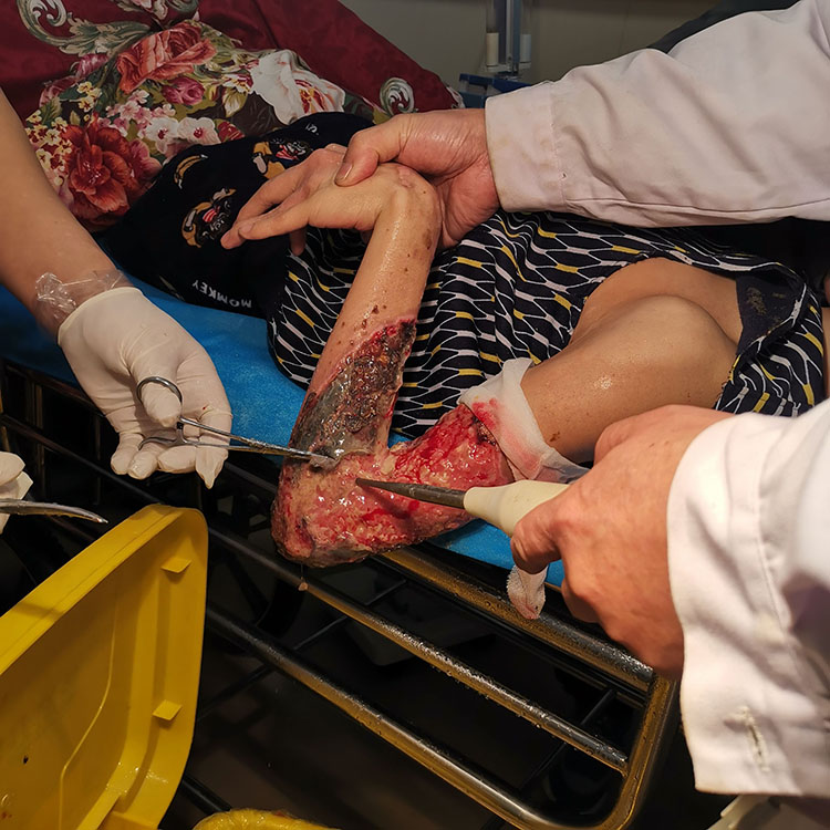 2月28日,應陽江市陽東區(qū)人民醫(yī)院骨二科李主任和梁主任邀請,北京榮祥再生醫(yī)學研究所副所長、中國中西醫(yī)結(jié)合學會燒傷專業(yè)委員會常務(wù)委員、《中國燒傷創(chuàng)瘍雜志》副總編輯、應用燒傷創(chuàng)瘍再生醫(yī)療技術(shù)治療糖尿病足領(lǐng)域?qū)<彝鹾樯魅螒皆摽剖抑笇?chuàng)面修復??平ㄔO(shè)及會診糖尿足潰瘍和壓瘡等慢性創(chuàng)面病人,并到手術(shù)室親自為三例慢性創(chuàng)面病人清創(chuàng)、換藥,指導創(chuàng)瘍再生醫(yī)療技術(shù)規(guī)范化應用,得到醫(yī)護人員和患者的高度好評。