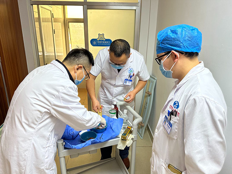 2023年2月27日,應霍邱縣第二人民醫(yī)院燒傷科主任徐凡的邀請,中國中西醫(yī)結(jié)合學會燒傷專業(yè)委員會醫(yī)療部張強主任來院會診2例燒傷和1例血管閉塞性潰瘍病人,現(xiàn)場講解了再生醫(yī)療技術(shù)換藥技術(shù)要點并演示做油紗換藥。