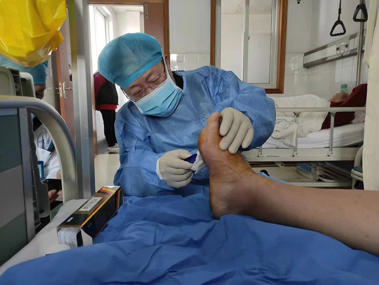 1月29日,《中國(guó)燒傷創(chuàng)瘍雜志》常務(wù)編委、燒傷創(chuàng)瘍?cè)偕t(yī)療技術(shù)臨床專家趙瑞慶教授,應(yīng)通州區(qū)第三人民醫(yī)院的再次邀請(qǐng),運(yùn)用再生醫(yī)療技術(shù)分別會(huì)診了四級(jí)糖尿病足潰瘍患者和長(zhǎng)期服用抗凝藥物,摔傷后致右下肢脛前皮膚破潰感染的患者。事后與當(dāng)?shù)蒯t(yī)務(wù)人員詳細(xì)制定進(jìn)一步治療計(jì)劃,糖足潰瘍患者聽(tīng)到右足能夠保住的喜訊,流下了感激的淚水。