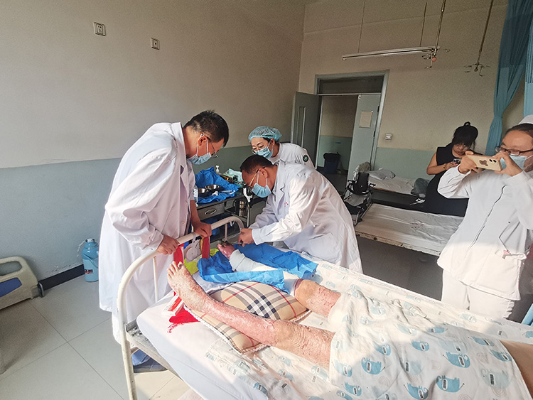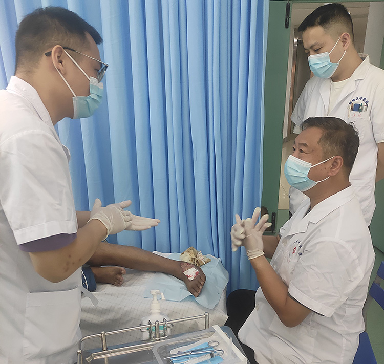 2024年9月22日, 應(yīng)黃江區(qū)中醫(yī)院外科葉峰主任邀請(qǐng),《中國(guó)燒傷創(chuàng)瘍雜志》編委、燒傷創(chuàng)瘍?cè)偕t(yī)療技術(shù)臨床專家張強(qiáng)來(lái)到該院會(huì)診,對(duì)一例腳部筋骨外露的透析患者現(xiàn)場(chǎng)示范換藥,講解換藥細(xì)節(jié),后與科室醫(yī)生就臨床中遇到的慢性創(chuàng)面的處理做了交流,此次活動(dòng)極大增進(jìn)了大家對(duì)再生醫(yī)療技術(shù)的了解,增強(qiáng)了運(yùn)用技術(shù)治療慢性創(chuàng)面的信心!